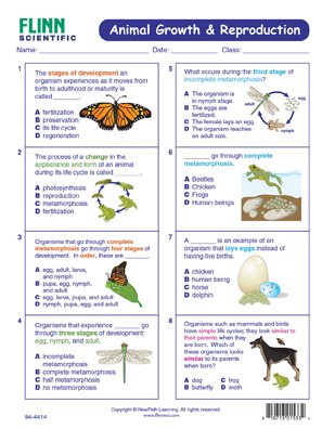 Animal Growth & Reproduction NewPath Visual Learning Guide provides comprehensive coverage of the growth and reproduction of animals. Each 11" x 17" guide includes four panels of helpful information, including an overview, practice exercises, a graphic organizer and assessment and review questions. Each laminated Write-On/Wipe-Off guide provides an engaging way to study animal growth and reproduction. Set of 10.