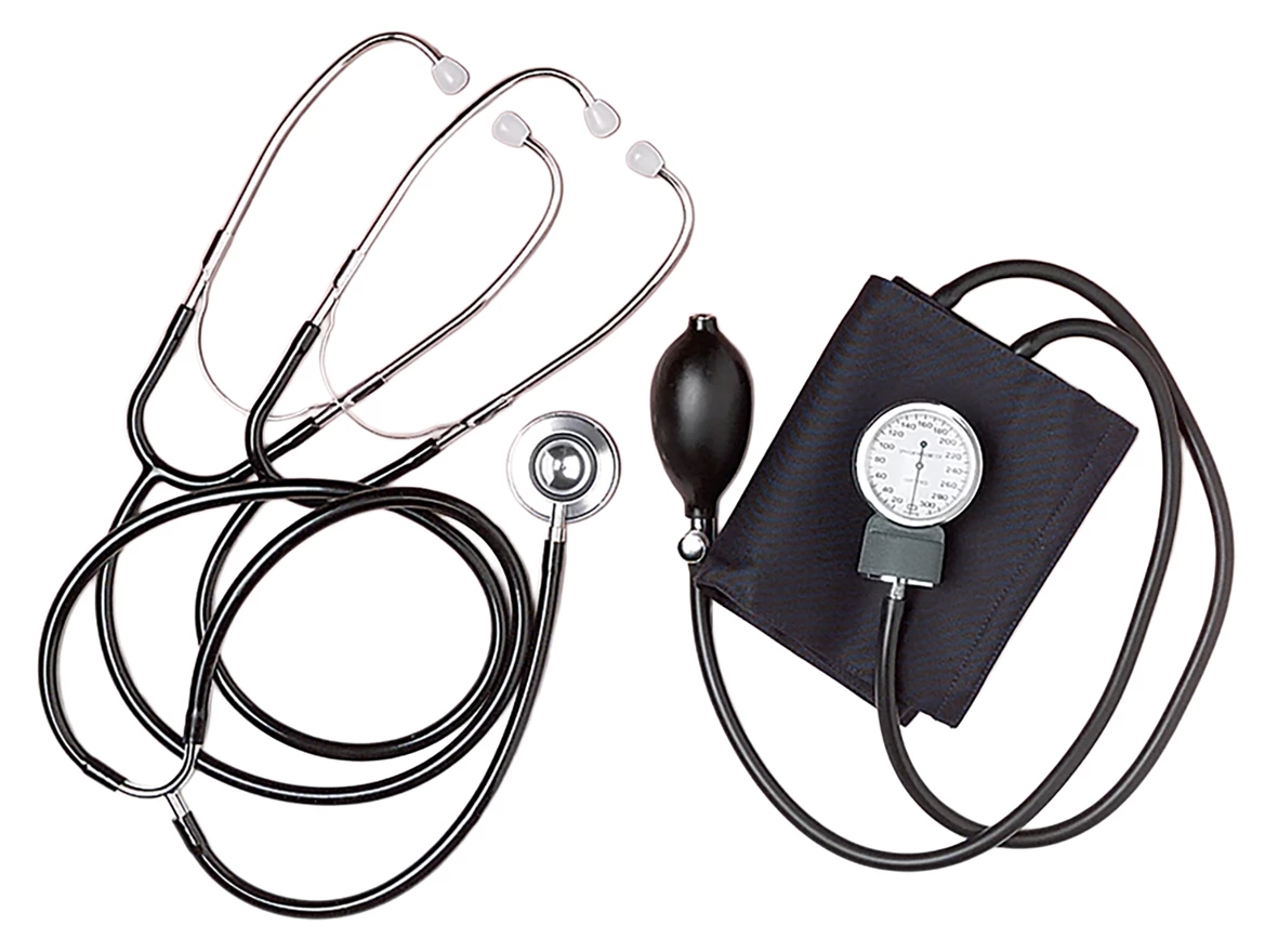Blood Pressure Teaching Set includes our Aneroid Sphygmomanometer plus our teaching stethoscope. Allows simultaneous listening for two.