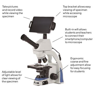 This microscope allows viewing at 4X, 10x, and 40X magnification. This microscope features the ability to connect a smartphone or computer to the built-in Wi-Fi, allowing you and your students to record or take images in real-time of what is being viewed. An attachable ipad bracket is included to mount your phone or tablet to the microscope for easy access as you view the sample.