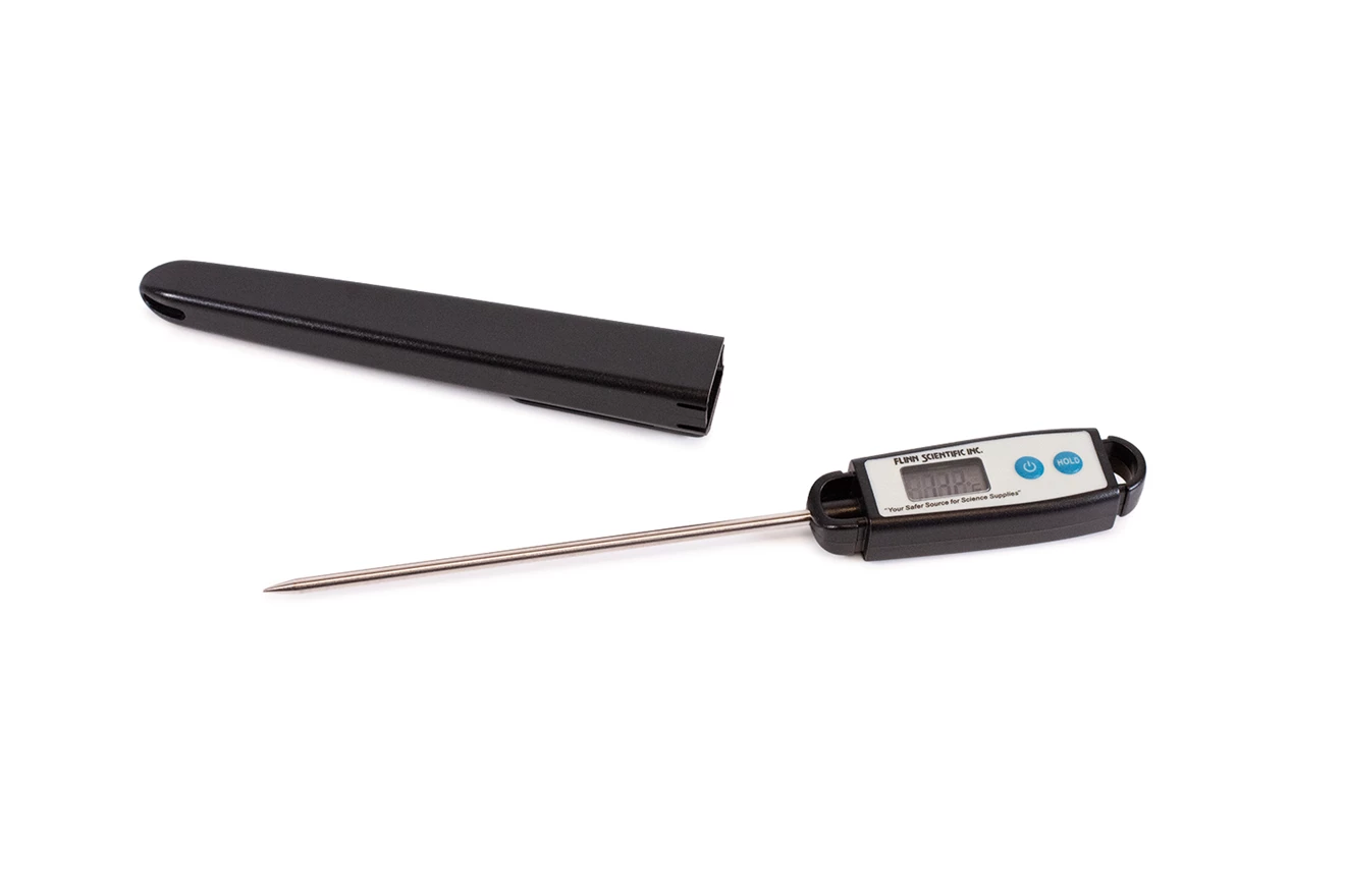 The Flinn digital pocket thermometer is compact, waterproof and easy to use. The stainless steel probe fits in its own plastic case with a pocket clip. The unit uses one 1.5-volt battery, which is included.