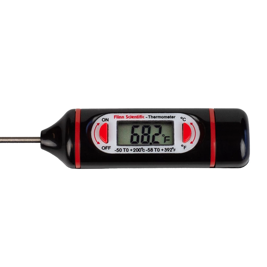 The Flinn digital thermometer gives readings that are much more precise than traditional glass thermometers and can be taken faster with the digital read-out. It includes a protective probe cover and one 1.5-volt battery.