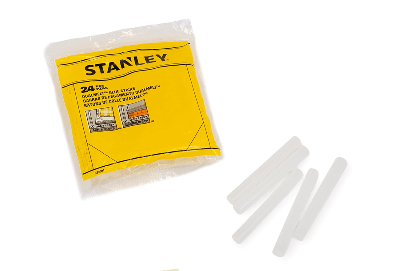Glue guns and glue gun glue sticks work great for wood, plastic, ceramics, fabrics, paper, and metals. The glue gun uses lever-action and has dual temperatures. The glue sticks are 1/2".