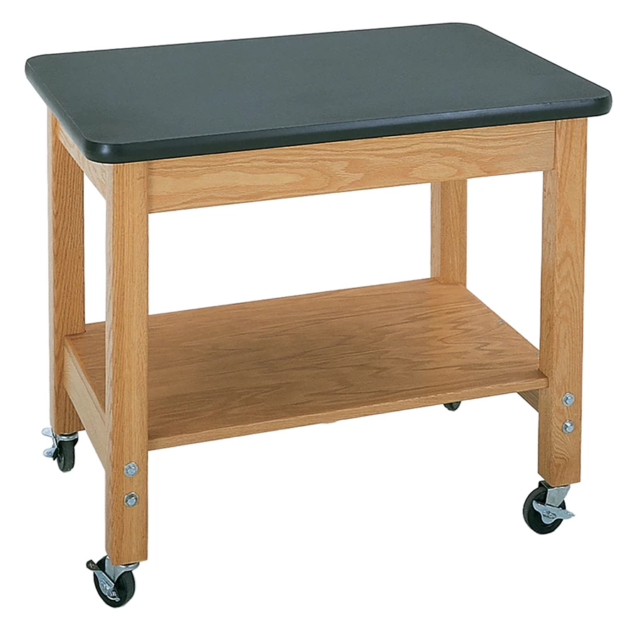The wood laboratory cart is a sturdy, multi-purpose lab cart designed for the transportation of equipment and supplies. The unit is solid oak with a plastic laminate top. The unit rolls easily on swivel casters with brakes.
