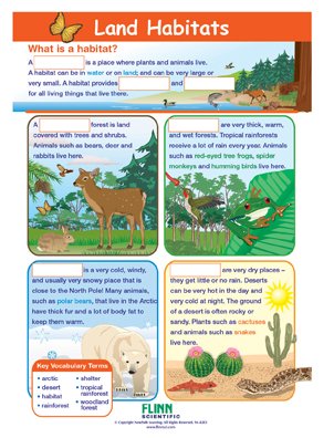Land Habitats NewPath Visual Learning Guide provides comprehensive coverage of the habitats found on land. Each 11" x 17" guide includes four panels of helpful information, including an overview, practice exercises, a graphic organizer and assessment and review questions. Each laminated Write-On/Wipe-Off guide provides an engaging way to study land habitats. Set of 10.