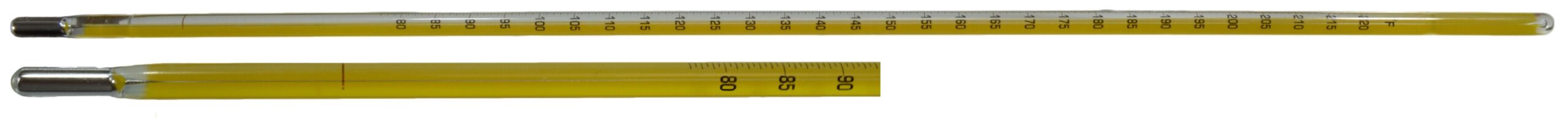 A 12"-long non-mercury thermometer with an accuracy range of ±1°C. The bright-colored fluid against a white background with permanently fused markings makes this thermometer very easy to read. Should be stored in an upright position to prevent the column from separating. Anti-roll device included.