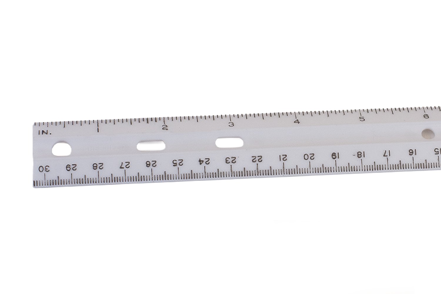 Metric/English. Durable, non-transparent plastic instrument graduated in cm and inches.