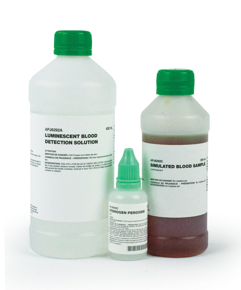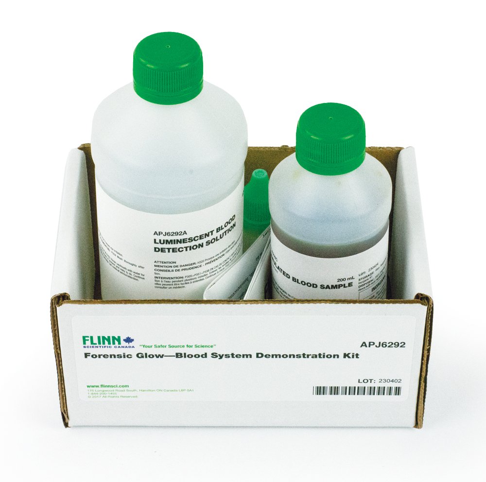 In the Forensic Glow Blood System Demonstration Kit, a simulated blood sample will be detected using a chemiluminescent blood detection solution similar to the type used by actual forensic scientists.