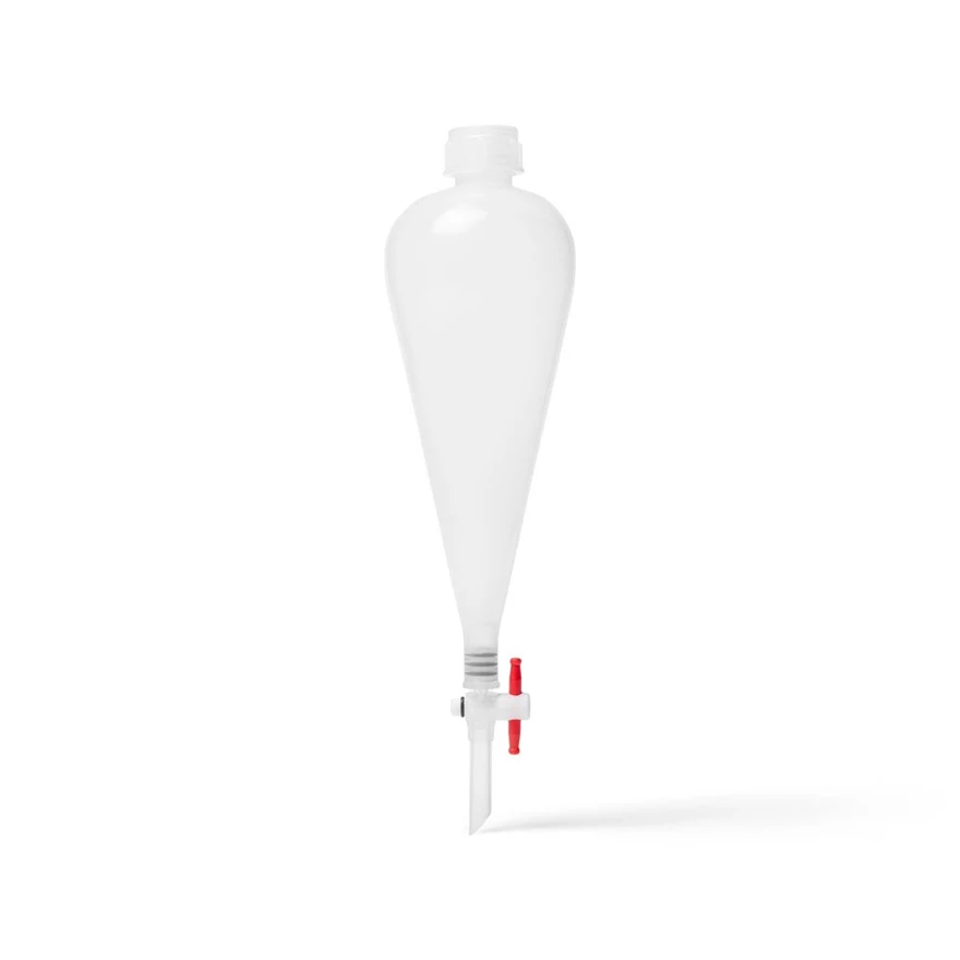 Polypropylene separatory funnels are pear shaped and molded of polypropylene with a screw top and stopcock. The polypropylene provides sufficient visibility of the liquid interface. The funnels come in three sizes.