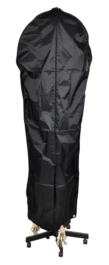 Protect your skeletons. The tough nylon construction and durable zipper make removal and replacement easy. The zipper runs down the entire front of the bag. The bottom is open to make removal easy. The reinforced slit on the top allows the hanging rod to be replaced for easy hanging on its stand. Virtually dustproof and indestructible. Measures 2 ft. in diameter and 6 ft. long.