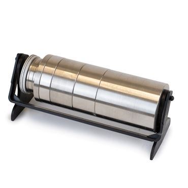 Comprehensive stainless steel slotted weight set with storage rack, designed for use with mechanical balances in classroom and laboratory settings.