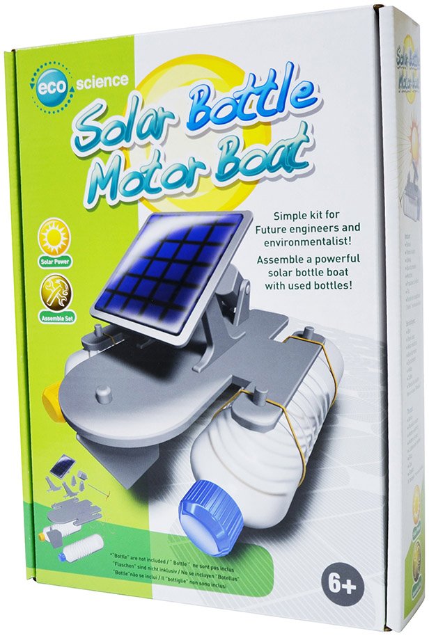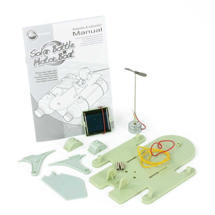 Integrate renewable energy and robotics with the Solar Bottle Motorboat. Assemble a powerful solar bottle boat with plastic bottles. Solar energy activates a motor that propels the robot forward in this simple kit designed for future engineers and environmentalists. Includes instructions and diagrams for constructing the motor boat. Bottles are not included.