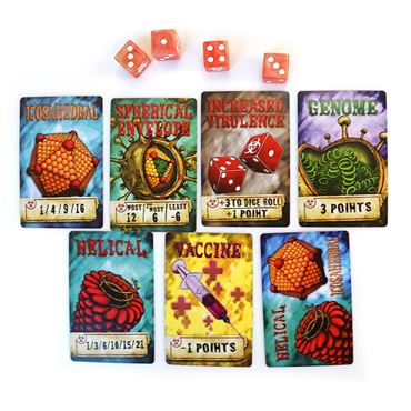 Virulence is a blind bidding game in which players take on the roles of viruses competing to infect a host cell. Players use their bidding hands to win (replicate) viral component cards in order to either score points or build the strength of their virus (their bidding hand) increasing their odds of winning critical bids later in the game. Virulence complies with NGSS standards and STEM principles. Gameplay takes approximately 20 minutes and accommodates 2–5 players.