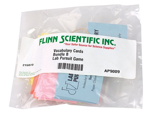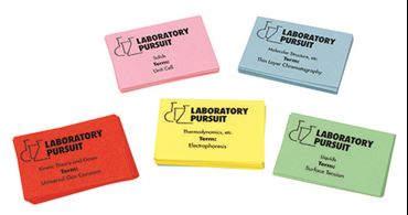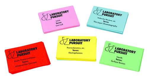 Vocabulary Cards for Laboratory Pursuit Game. Also great as stand-alone flashcards! Bundle A Concepts: Introductory terms, scientific method, measuring and calculating, matter and energy, chemical formulas, the mole, chemical reactions, atomic structure and models, the periodic table and its trends, and chemical bonding. 144 cards. Bundle B Concepts: Molecular structure, polar molecules, chromatography, solids, liquids, kinetics and gases, thermodynamics, solutions, and colligative and colloidal properties. 108 cards. Bundle C Concepts: Reaction rate, chemical equilibrium, acids, bases, salts, electrolytic solutions, oxidation-reduction, electrochemistry, nuclear chemistry, organic chemistry (structure, naming, and reactions), and biochemistry. 121 cards.
