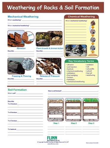 Weathering of Rocks & Soil Formation Visual Learning Guide provides comprehensive coverage. Each 11" x 17" laminated Write-On/Wipe-Off guide includes four panels of helpful information to engage students in the study of this topic.