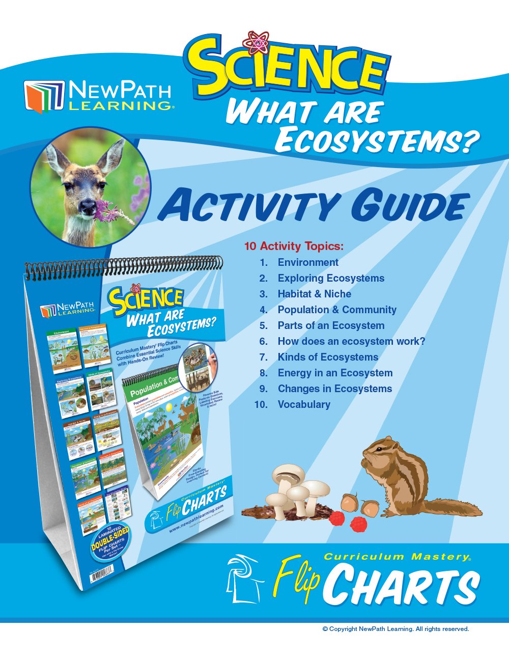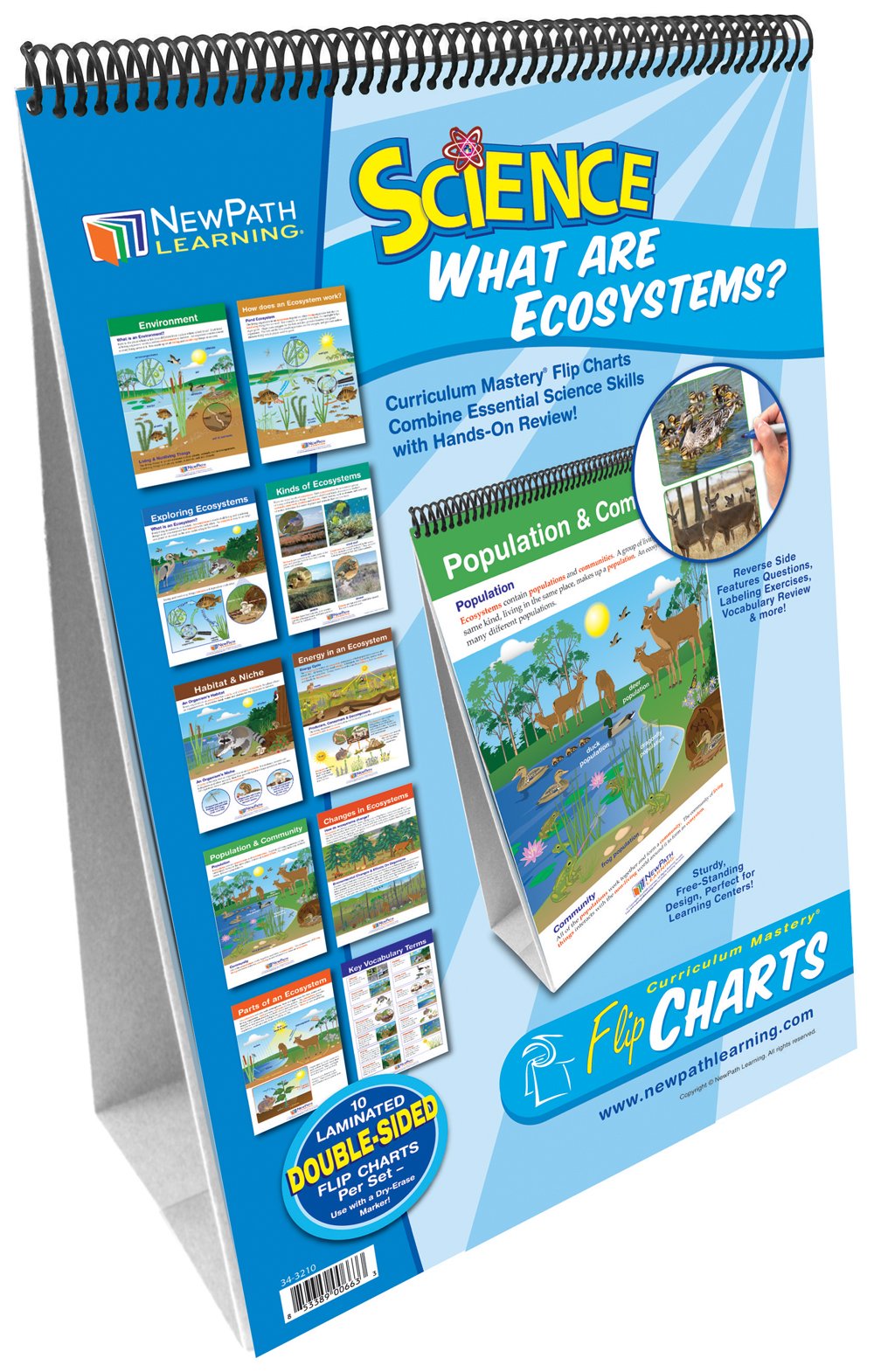 Introduce and review standards-based concepts on Ecosystems. The set features 10 double-sided, laminated charts, each 12” x 18” and spiral-bound on a durable, free-standing easel. Side 1 of each chart features a graphic overview of topic while Side 2 serves as “write-on/wipe-off” activity chart. Also includes Activity Guide featuring copy-masters and exercises. Covers: Environment; Exploring Ecosystems; Habitat & Niche; Population & Community; Parts of an Ecosystem; How Does an Ecosystem work?; Kinds of Ecosystems; Energy in an Ecosystem; Changes in Ecosystems; and Vocabulary.