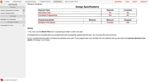Then it’s finally time to compete in the Virtual Race! In this competition portion of the activity, students see how their designs measure up against each other. After completing their design and applying any improvements, the Outputs section creates print templates for a physical build of the rover chassis. Now that students have conquered the virtual world, it’s time to Build and Test the rovers in the physical world. This section includes instructions and tips for uploading the code and to build a physical representation of their design.